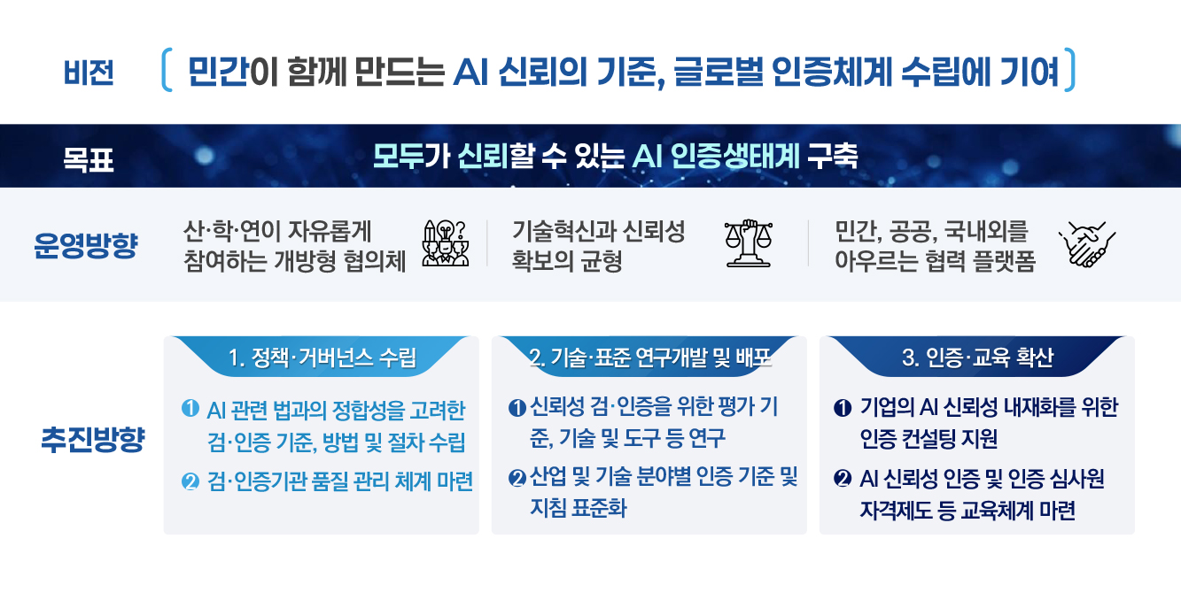 인공지능 신뢰성 검‧인증 제도의 민간 인증생태계 확산 및 기업 지원을 목표로 활동하고 있습니다.