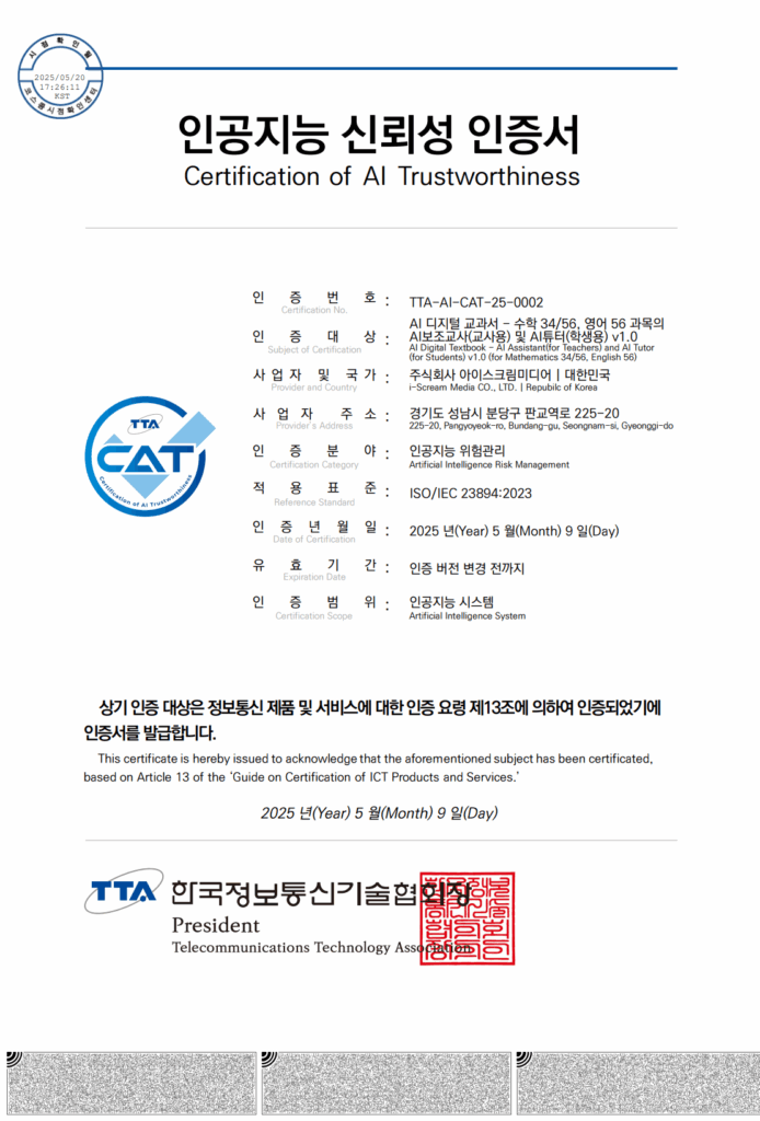 - 제품명 : AI 디지털 교과서 – 수학 34/56, 영어 56 과목의 AI보조교사(교사용) 및 AI튜터(학생용) v1.0